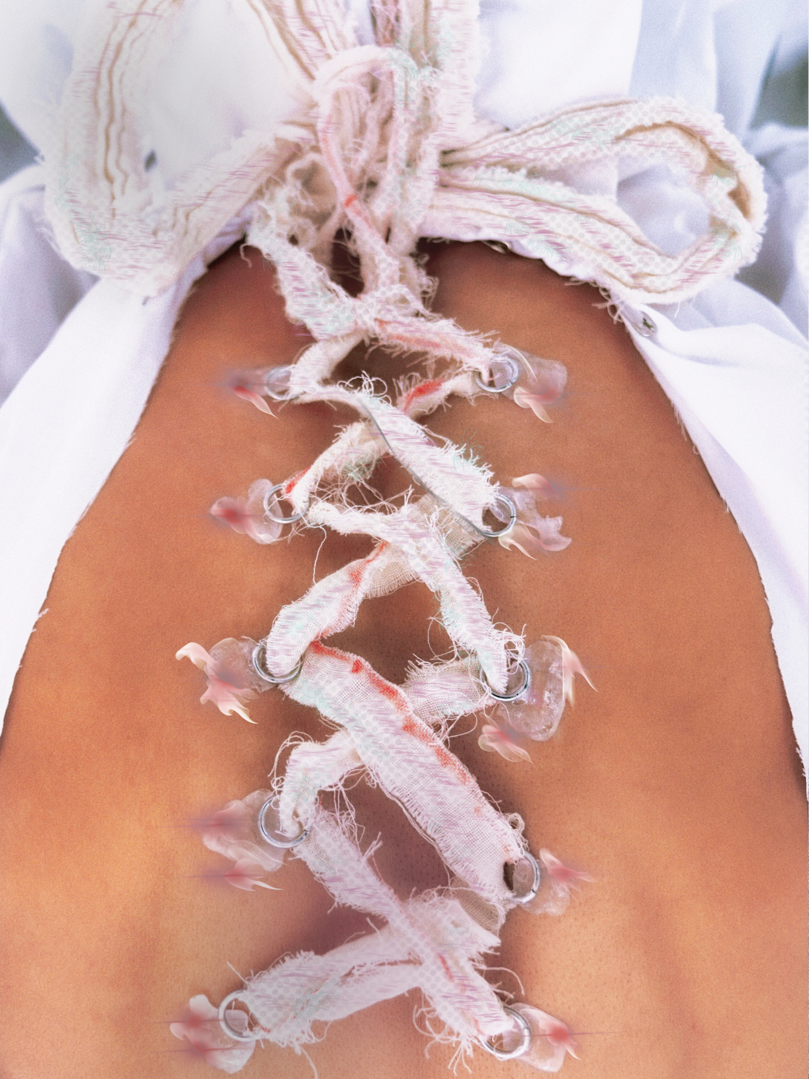 Taking 'send return' (2023) beyond traditional boundaries, Cheng collaborated with photographer Peidi Z to initiate 'RIBBON ATTACK' (2023), an experimental interactive performance. Two performers adorned in metal garments, specially designed by Tiffany W for this project, interacted with the installation. Their movements were captured in photographs, which Cheng later digitally reimagined, blending her digital painting methods with the essence of the captured performance.